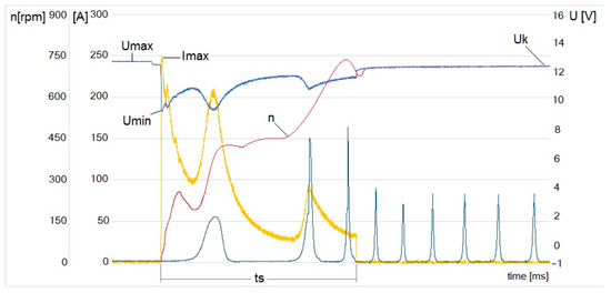 There are multiple definitions of an engine cold start or engine warm up found in the literature [70,75,104]. In the literature on the subject, there are many possibilities in evaluating the parameter of start-up time. In these tests, the start-up time was determined based on the moment a stable rotational speed of the engine crankshaft was obtained. On the other hand, the starter operation time was determined on the basis of energy consumption time at the battery terminals. The parameter ts is the starter operating time [ms], understood as the time that elapses from the moment the starter is turned on until it reaches unloaded operation. Imax is the maximum value of the current consumed by the starter at the beginning of the start-up [A], which is an indirect measure of the resistance to movement at the start of the engine. The Umax parameter describes the maximum voltage value measured at the battery terminals just before the engine start-up process [V]. Umin describes the minimum voltage at the beginning of the start-up [V], Uk describes the voltage at the end of data recording after the start-up [V], and n is the engine speed [rpm]. In Figure 2 is a chart showing the values and parameters of the start-up process recorded during the test sample.