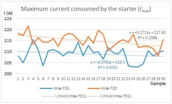 If we look at the trend line in the case of the starter operation time (Figure 7), we can see that the second series with an increased fuel dose, FD2, needed more time to start the engine than in the series with a nominal fuel dose, FD1; i.e., as already stated above, the starter performed a greater work. However, in the case of these two test series of starting tests of the diesel engine, the starter operating times, and therefore the engine start-up time, do not show any major differences. It can therefore be said that with the assumed starting parameters, fuel supply system, and given ambient temperatures, the starter operating time shows similar empirical values. For comparison, the values of the starter operating time when trying to start the engine can be quoted. Thus, for series 1 (with FD1), the shortest starter operating time was 621.6 ms, while the longest time was 932.4 ms. In the case of test series 2, the shortest starter operating time was 562.4 ms, while the longest starter operating time in this series was 962 ms. Therefore, it can be said that the start-up time is random and independent of the settings of the engine control parameters, which is also visible in the interpenetration of the trend lines of both measurement series. The presented values also indicate slight differences in start-up times between the compared test series. Moreover, it can be concluded that a higher fuel dose means a larger amount of fuel–air mixture inside the cylinder, i.e., in the combustion chamber. Compressing a larger volume of refrigerant causes greater resistance to piston movement and the starting system must overcome the additional load, providing greater engine torque, which is also visible in a higher value of starting current (Imax).