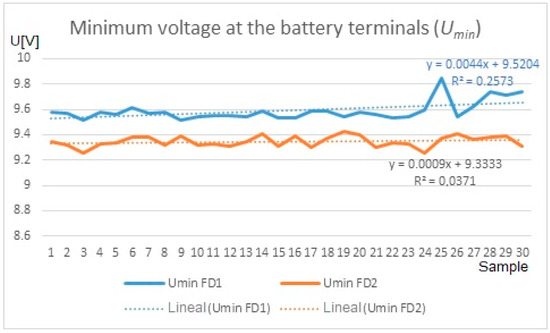 Analyzing the graph in Figure 4, it can be seen that in the case of the second test series, i.e., the test with an increased dose of FD2 fuel, lower values of voltage drops on the starter battery were obtained. This indicates that a larger amount of fuel in the combustion chamber places a greater load on the starter battery. It should also be noted that in most cases, very similar voltage values were obtained, and the voltage course is basically undisturbed. And looking at the trend lines, they run similarly in both measurement series, which is also confirmed by the correlation coefficient R2.