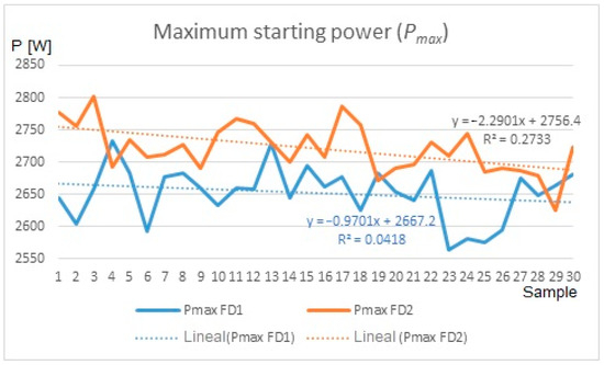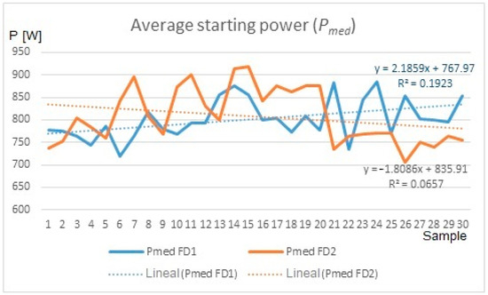 Analyzing the course of the graph in Figure 6, it is difficult to notice the dominant tendency, but based on empirical data, it can be said that the average starting power Pmed is higher for a series of starts with the larger fuel dose FD2. This means that in the case of an increased fuel dose in these ambient conditions (average starting temperature of 23 °C), the growth of fuel in the combustion chamber causes a greater demand for electrical power, i.e., the starter must perform more work than in the case of starting the engine with the nominal fuel dose. It should be remembered that temperature has a significant impact on the start-up process of combustion engines, which is confirmed by numerous publications [71,79,106,107].