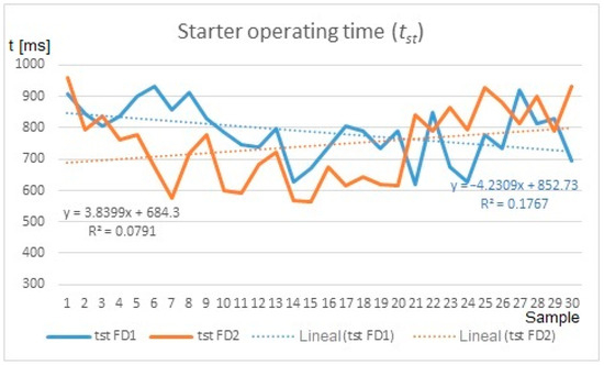 Figure 7 shows the values of the starter operating times in each series of tests, expressed in milliseconds ([ms]).