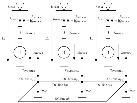 HVDC point-to-point (P2P) systems are the most common implementation of HVDC systems. HVDC P2P systems are connected via a DC line and therefore can be connected to remote buses. The typical application is the bulk power transfer, e.g., the generated power of large offshore wind farms, to load centres over long distances. For applications such as meshed DC systems, more complex structures are needed. A multi-terminal- (MTDC) modelling approach is given in Figure 3.