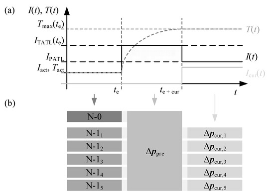 - the power flow situation in the N-1-case before the curative measure takes effect, within which the temporary admissible transmission loading (TATL, represented by the current ITATL ensuring that the maximum temperature Tmax is not reached before the end of the full effect in timespan (te+cur − te) of the curative measure in Figure 4a) must be complied with using one set of preventive measures (see Equation (12)), and
