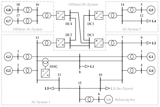 For this purpose, the respective nodes 4 and 7 of the systems are combined and the SSSC for explicit power flow control is relocated from line 7–8 to line 8–11 running in parallel in the new configuration. The system therefore consists of a meshed AC system with two connections to an as well meshed DC system, representing, e.g., a future meshed offshore system. Additionally, two other AC systems are connected to the DC system, representing an offshore feed-in and a further simple AC system with generation and consumption.