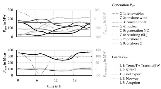 The investigated diurnal cycle contains strong changes in the individual generation, meaning that even within the relatively short period of 24 h, large differences in the resulting power flows in the grid occur, which consequently are resulting in differing challenges for ensuring a secure system operation. Figure 6 shows an overview of the resulting time series on the generator and consumer side.