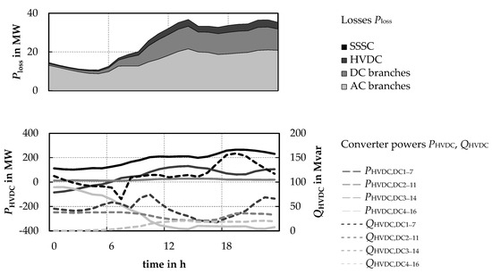 Figure 7 shows the resulting values of the objective function value broken down to individual losses considered and the resulting time series of the active and reactive power of the HVDC converters.