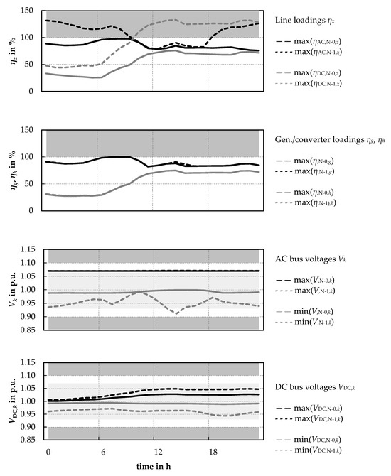 In a second step, a failure variant calculation is performed. For this purpose, line outages of the lines 7–8, 8–11, 10–15, and 13–15 of the AC system 1 (all of them referred to as ‘AC’ in Table 1) as well as of the lines DC 1–DC 2 and DC 1–DC 4 of the DC system (‘DC’ in Table 1) are evaluated, whereby the operating points of generation and consumption as well as of the HVDC system are kept as calculated in the base case. The failure variant calculation provides the load factors and resulting limit violations as shown in Figure 8 (values in the grey shaded area of the plot). These are shown together with the respective time series in the base case N-0, whereby the representation contains only the maximum and minimum values of the corresponding quantities over all elements and failure variants.