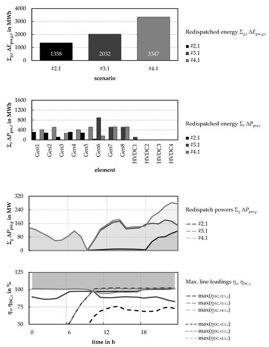 A comparison of the scenarios shows that the measures required to ensure N-1-security in the AC and DC systems, respectively, do not simply add up, but can also be lower (as in the present example: #2.1 + #3.1: 3390 MWh, #4.1: 3347 MWh; Figure 9), but in other cases could also be higher. This is due to the inherent interdependencies in combined AC/DC systems and leads to the fact that these congestion mitigation measures have to be determined together.