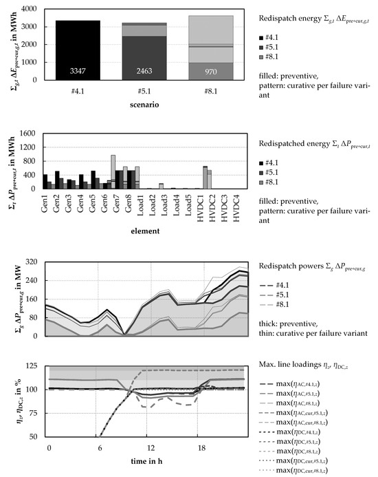 Here, in the comparison of the preventive scenario #4.1 with the curative scenario #5.1, on the one hand, the preventive measure input is reduced by more than 25% by the available curative operating point change, whereas on the other hand, the additional flexibility in the form of the HVDC converters (in the curative input) can also slightly reduce the total quantity of necessary measures. In comparison, an extensive curative deployment of various flexibilities in curative scenario #8.1 can reduce the preventive measure deployment by around 70%, whereas the total quantity of measures (when adding the curative measures determined per failure variant) increases slightly. This is since the curative measures used may have a lower sensitivity to the bottlenecks than the available preventive measures, but due to the preferential application via a lower weighting in the objective function, they are used more. Figure 10 shows that all available curative measures (decentralised curtailment of generation plants, curtailment of offshore wind energy, and HVDC working point change) are used to minimise the respective preventive input.