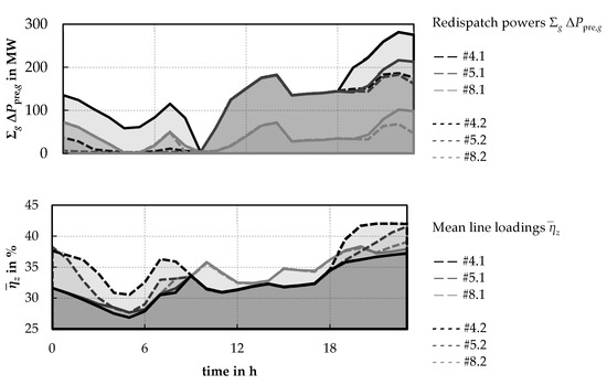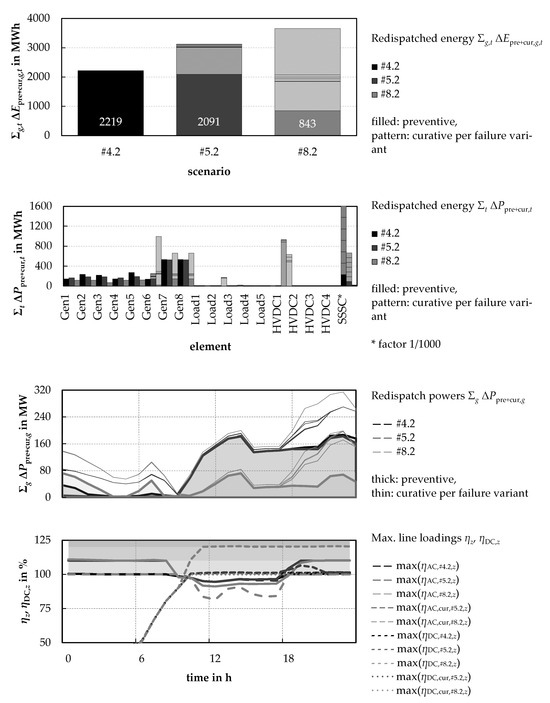 In a third simulation step, the effect of specific power flow control for the reduction of preventive (and, if necessary, curative) measures will be addressed. Therefore, the preceding simulation scenarios are used, whereby specific power flow control by the SSSC integrated in line 8–11 is included as an additional flexibility. For distinction, these scenarios are referred to as preventive-curative scenarios with power flow control #4.2, #5.2, and #8.2.