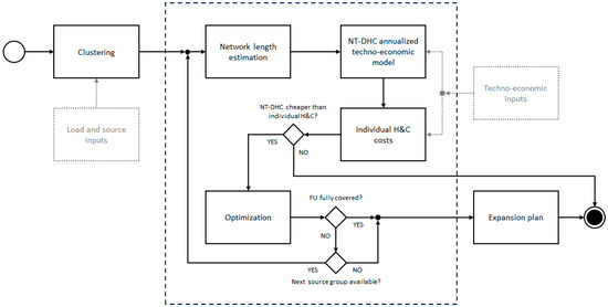 The entire methodology is meant to be swift and user-friendly to support the preliminary phases of NT-DHC expansion planning. Consequently, priority is given to simplicity rather than to high accuracy. The aim is to guide the expansion of the system by determining the most profitable areas through energy assessments and subsequent financial calculations. As the spatial resolution used to analyze the NT-DHC network scenarios corresponds to the urban scale, a functional unit (FU) of 1 km2 of residential areas was defined as default choice. A reference area of this size has already been investigated in previous publications [53,54]. The overall model is composed of different modules (Figure 1). Three main categories of inputs are used: heat load data (arranged in hectare-size cells), heat source data (arranged in source groups), and techno-economic parameters (including, e.g., operating temperatures and energy prices). The logic flow is as follows: (1) heat load clusters of sizes compatible with the available sources are identified; (2) an expansion iteration for the first source group is started (articulated in four steps: (i) network length estimation, (ii) yearly techno-economic analysis for each cluster, (iii) a comparison against individual H&C solutions and the exclusion of non-feasible clusters, (iv) the optimized selection of remaining clusters); and (3) the process is iterated until either the full FU is covered or no other source groups are available. The output is an expansion plan in multiple phases (given by the number of source groups), where each phase is defined by an optimal set of clusters for the corresponding source group.