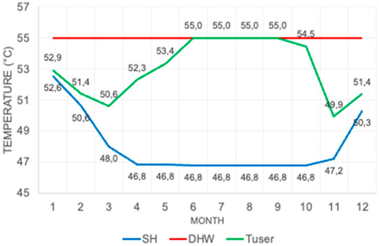 The temperature for DHW () is assumed to be 55 °C. Exploiting the demand profiles described in Section 2.1.2 (HDD distribution for SH and constant distribution for DHW), a single effective temperature for users is calculated as the weighted average of the SH and DWH temperatures. In this way, a single outlet temperature profile can be assigned to the condenser side of decentralized HPs. Figure 2 shows an example of the monthly average pattern for the resulting curve. Depending on the case, it should be adjusted based on the specific climate conditions affecting the energy needed for SH, ambient temperature, and building setpoints ( and .