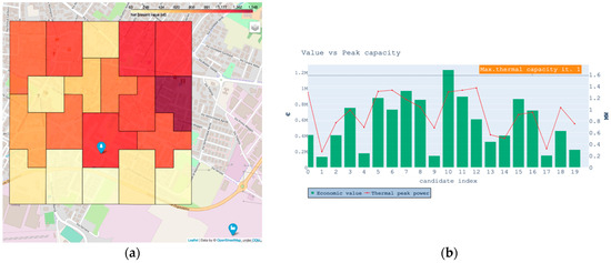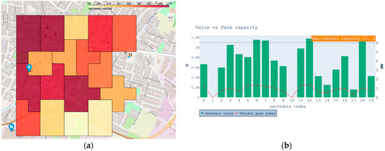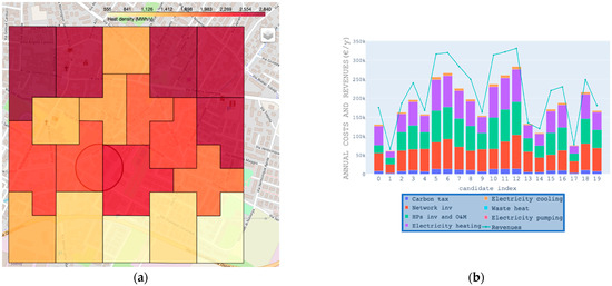 (a) The clustering method applied to the case study. The inputs are the latitude, longitude, and heat density of each city hectare. (b) Annual costs and revenues per candidate. The difference between the green line and the bars represents the net economic margin per year (EUR/y).
