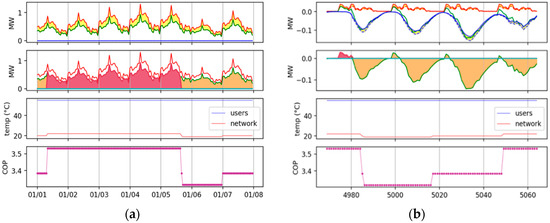 Example of energy balances calculated by the techno-economic model for the case study considered below. (a) Behavior of a representative winter week. First panel from top: load power (red/blue: heating and cooling loads; solid/dashed: gross/net values, i.e., user/network side; green: overall net load). Second panel from top: source power (red areas: waste heat; orange areas: aquifer wells; when visible, individual curves are the same as in the top panel). One can recognize the five working days when WH is available and the weekend when aquifer wells are exploited. Lowest panels: operating temperatures and COP values according to axis and legend. A drop in COP is visible in the weekend due to the lower source temperature provided by the aquifer wells with respect to WH. (b) Behavior of a representative summer week.