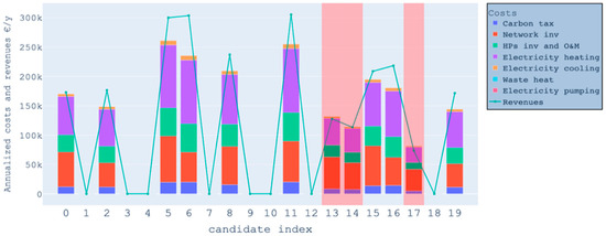 The model calculates the NPV of the remaining loads, including SBs, in the third iteration. All feasible loads are served by the NT-DHC system with 15 MW thermal capacity. Zones in the southern part of the FU are not connected to the network (Figure 8) and can use reversible A/W HPs at a lower cost than the NT-DHC solution (Figure 9). The process concludes if a better scenario cannot be reached compared to the BaU case or if the NT-DHC fully serves the FU. The expansion pathways for the NT-DHC system are shown in Figure 10.
