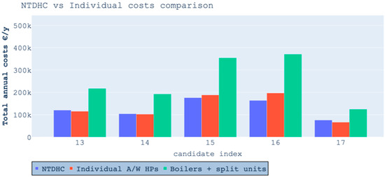 Cost comparison of H&C options. A/W HPs are preferred in Clusters 13, 14, and 17 over NT-DHC due to their lower cost.