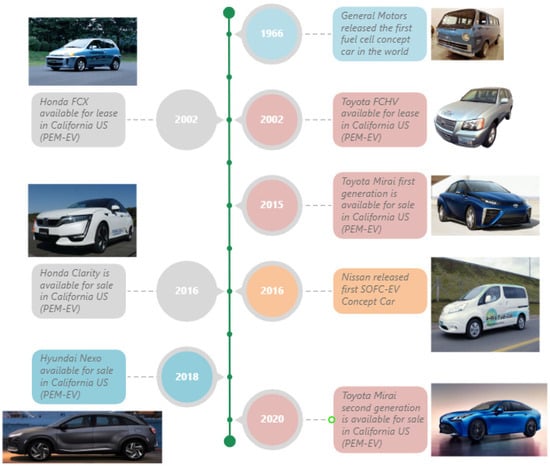 FC-EV reviews in the past have predominantly centered on proton-exchange membrane fuel cell (PEMFC) development and implementation in electric vehicles. For example, Li et al. published a review focusing on hydrogen storage systems [17], while Sankir provided a detailed book review on hydrogen electric vehicles [18]. Interestingly, despite previous considerations that solid oxide fuel cells (SOFCs) were unsuitable for electric vehicle applications, Nissan demonstrated their feasibility in 2016 [19]. SOFCs are renowned for their fuel flexibility, namely their ability to use hydrocarbons as well as hydrogen as fuel. This breakthrough has broadened the possibilities for incorporating various types of fuel cells into electric vehicles and therefore providing a bridge technology if fuel-cell technology is diversified beyond PEMFCs.