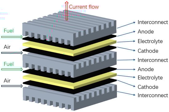 Unlike PEMFCs, SOFCs have all solid-state components. Regardless of the various shapes and designs of SOFC stacks, they all have the same components and working principles. A single SOFC consists of a porous anode and cathode on each side of the dense electrolyte. Reactions take place on each side of the electrode simultaneously. On the cathode side, where it is exposed to air, oxygen molecules are reduced to form oxygen ions (O2−). They are diffused through the electrolyte to the anode side, where the fuel (typically H2) is oxidized to form water vapor (H2O). Since this is a chemical reaction, it has an open circuit voltage of around 1.2 V, before any useful amount of current can be collected. SOFCs must be stacked in a series to produce enough voltage and power. When constructing SOFC stacks, interconnects are used as physical mounts, fuel/air manifolds, and electrical/thermal conductors for each unit cell, as shown in Figure 5 [51,52].