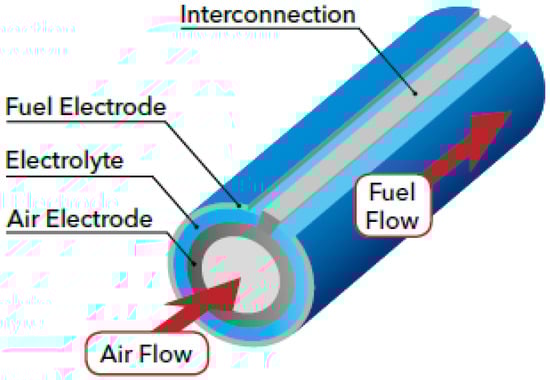 There are two commonly used design configurations for SOFCs. One is planar SOFCs, as shown in Figure 2, where the layers are stacked on top of each other. The interconnect acts as a gas channel and also as a separator for the anode and cathode side of the SOFC [38,39]. An alternative is a tubular SOFC, as shown in Figure 3, where cells are constructed in layers around the cathode, with a hollow center for airflow and fuel flows on the exterior side of the tube [38]. Tubular SOFCs were the first commercially introduced SOFCs, and they have high manufacturing costs and high electrical resistance compared to planar SOFCs. Table 1 highlights some key differences between the planar and tubular SOFCs. SOFCs are unlike other PAFCs and MCFCs due to their solid-state nature and more stable form, and they could be used for FC-EVs and are highlighted as a promising alternative.