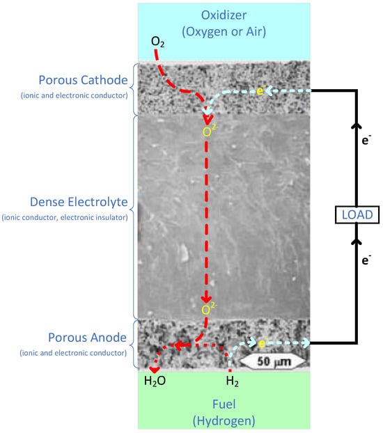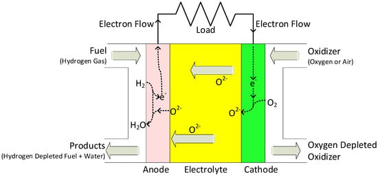 The SOFC anode is porous in order to allow (hydrogen) fuel to flow to the electrode/electrolyte interface. It is responsible for catalyzing the oxidation of the fuel at the layer where the anode and electrolyte meet, as illustrated in Figure 6. The fuel, typically hydrogen; incoming oxide ions from cathode side; and the oxidizing catalyst, all combine at this triple phase boundary (TPB) [53]. This TPB reaction can be given by Equation (7):