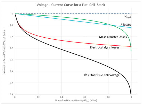 The average PEMFC lifespan projected in automotive applications, which includes the effects of road vibration [47], is in the range of 3700 h, with 10% voltage degradation [48]. The purity of hydrogen is a critical factor in the durability of PEMFCs, as most hydrogen is extracted from natural gas, which may contain traces of CO in the fuel. This CO can poison Pt-based catalysts, preventing the hydrogen and oxygen from reaching the catalyst. Another significant cause of degradation is related to water management in the fuel cell (i.e., the control of humidity on the membranes). If the membrane is too dry, its ionic conductivity will be reduced. Under very wet conditions, flooding occurs, blocking the reaction gas’s reach to the reaction site [49]. Moreover, with high-power-density operation, water accumulates faster, resulting in rapid performance degradation [50]. Improving water management is crucial to overall system performance.