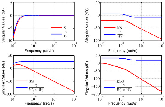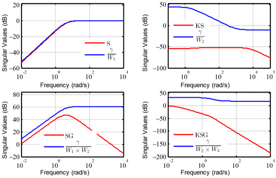The constant γ is defined as the minimum value to maintain system stability. The above-mentioned weighting functions are chosen to limit the sensitivity matrix, the control energy matrix, and the complementary sensitivity matrix of the controlled system. Applying the minimum gain theorem makes the norm of P(s) less than unity: