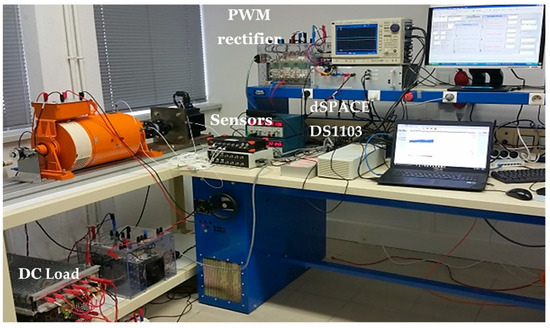To evaluate the performances of the designed cascaded H∞ controller, an experimental setup has been prepared, as shown in Figure 6. The proposed strategy, illustrated in Figure 3, is implemented on a dSPACE control prototyping system. The grid-side stage consists of a three-phase generator controlled to provide a three-phase AC supply of (80 V, 50 Hz). The grid-side generator is connected to a three-phase SEMIKRON converter that supplies a DC resistive load. The experimental system parameters are given in Table 2. Three tests are realized to evaluate the proposed control in terms of reference tracking and disturbances rejection performances under load transient and unbalanced grid voltage.