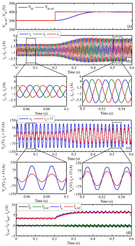 Experimental results under DC-link reference step change from 300 to 400 V: (a) DC-link voltages Vdc and Vdc ref; (b) three-phase grid currents iabc; (c) grid current ia and grid voltage ea and (d) dq-axis current components and their references.