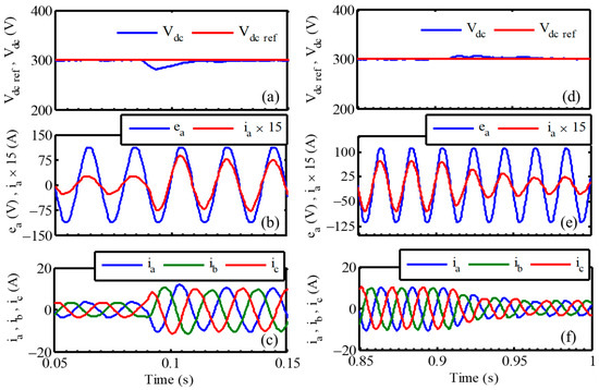 In this test, the proposed control method is evaluated under load step changes. Load step changes from 250 Ω to 110 Ω and then from 110 Ω to 250 Ω are considered. The obtained results are illustrated in Figure 8. Figure 8a highlights when the load changes from 250 Ω to 110 Ω that the DC voltage drop is very low. The DC voltage drop is below 5% from a reference value of 300 V. Figure 8c,f show the corresponding grid voltage and current of phase a. This result confirms that the unity power factor is maintained. It can be seen that balanced input currents with low THD are obtained. The DC bus voltage is regulated with suitable load disturbances rejection performances, as shown in Figure 8a,d.