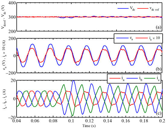 To investigate the proposed control performances under unbalanced conditions, a test under grid voltage unbalance is performed. The grid voltage unbalance is achieved by adding a resistor of 7.2 Ω in series with the passive L filter of phase “a”. This causes a voltage sag of 10% on phase a. The resulting unbalanced grid line currents are illustrated in Figure 9. Figure 9a illustrates that the proposed control strategy allows us to maintain a well-controlled DC bus voltage with good disturbances rejection when the unbalance occurs. Furthermore, Figure 9b shows the grid-phase current ia and voltage ea, which are synchronized to maintain the unity power factor. In Figure 9c, the three-phase grid currents waveforms have been illustrated when the imbalanced condition occurs.