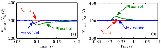 Experimental results of DC-link voltage under load disturbances comparison between conventional PI control and proposed H∞ control: (a) load step change from 250 Ω to 110 Ω and (b) load step change from 110 Ω to 250 Ω.