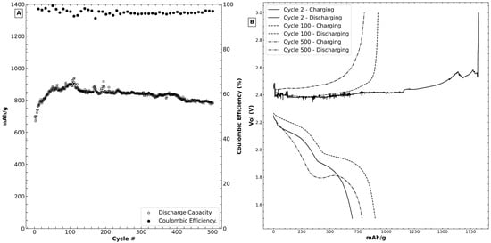 During discharge, solid sulfur (S8) is reduced into a lithium polysulfide after dissolution in the electrolyte, which is reflected in a stepwise voltage discharge profile analogous to what is shown in Figure 3B (cycle 2). A plateau is visible in the discharge voltage vs. Li reference (2.4 to 2.2 V) associated with reducing elemental sulfur to Li2S4. A secondary plateau (around 2.1 V vs. lithium) is strongly associated with the formation of Li2S2. The tail end of this discharge region, where the plateau begins to noticeably slope downwards, brings about the formation of the insoluble Li2S species [28]. This behavior is reflected in the literature and can be due to the activation of the cathode [26], which in turn leads to the better distribution of the sulfur species and a slower formation of a stable SEI layer. It has been demonstrated in previous efforts that capacity degradation of the lithium–sulfur system occurs mostly in the higher plateau region [6], which is present in the discharge voltage plot in Figure 3B (cycles 2 and 100) but clearly absent from cycle 500. This in turn might explain the discharge capacity retention that the CNS-S cell demonstrates after the 112th cycle [13,16,27].