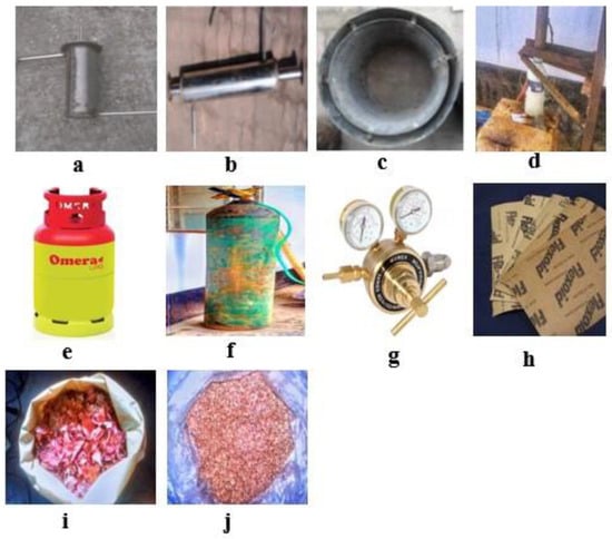Several instruments were used to construct the designed pyrolysis system, as shown in Figure 1. The reactor, shown in Figure 1a, is an enclosure where the feedstock material (onion shell) is pyrolyzed in an inert atmosphere. The reactor was surrounded by a biomass heater. The reactor gained heat from the biomass heater. Nitrogen (N2) gas was supplied inside the reactor to create an inert atmosphere. Furthermore, the processed onion shell was decomposed in the absence of O2. A condenser, which is actually a parallel flow heat exchanger used to cool down the hot gases coming from the reactor, is a hollow-shaped cylinder, as shown in Figure 1b, through which a small-diameter pipe was passed. The gas from the feed material flows through the pipe, while the water flows outside the pipe through the hollow cylinder. The hollow-shaped cylinder had two openings. One opening was attached to the upper portion, supplying the cold water, and another opening was at a lower portion, rejecting hot water from the condenser. The entire condenser remained cold by the continuous flow of water. The reactor temperature was recorded using a digital thermometer of the TM6801B model, Winston, Zhejiang, China, having a K-type thermocouple of nickel–alumel materials with a measurement range of up to 1300 °C, inserted through the top to the middle of the reactor, where the pyrolysis occurred. Proper sealing was performed so that the gas could not escape. Figure 1c shows a biomass heater, which is a cylindrical shape confinement. Two cylindrical shapes were attached by clamps to make the biomass heater. The inside hollow cylinder was made of a 24-grade mild steel sheet of 15 cm in diameter, and the outside hollow cylinder was made of an 18-grade mild steel sheet of 20 cm in diameter. Glass wool was used between the two cylinders to make it heat resistant. In this work, solid fuels, like briquettes (charcoal) and a wood powder mixture, were used as fuel to produce the heat required for pyrolysis.
