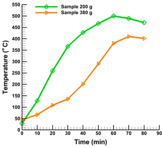 Effect of sample quantity (200 g and 380 g) on reactor temperature.