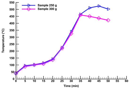 Effect of sample quantity (250 g and 300 g) on reactor temperature.