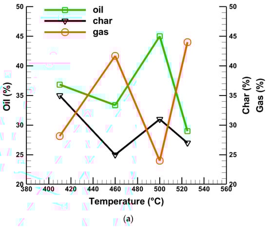 Figure 6 shows the oil, gas, and char production at different temperatures, sample quantity, and sample size. Figure 6a presents the percentage of oil, gas, and char production at different temperatures. It is seen from Figure 6a that for a 200 g sample quantity and 250 µm average particle size, the maximum oil production is 45% at about 500 °C where the char generation is about 30%, and gas production is the lowest at about 24%. On the other hand, a maximum gas generation of about 44% and a minimum of 29% oil products are produced at 525 °C for a 250 g sample quantity and 300 µm average particle size, respectively, as shown in Table 5. Figure 6b shows the percentage of oil, gas, and char production at different sample quantities. It is clear from Figure 6b that the maximum liquid oil generation of about 45% is achieved for a 200 g sample quantity, whereas gas production is the lowest at around 24%. The same conclusion can be made for a sample size of 250 µm, as depicted in Figure 6c.