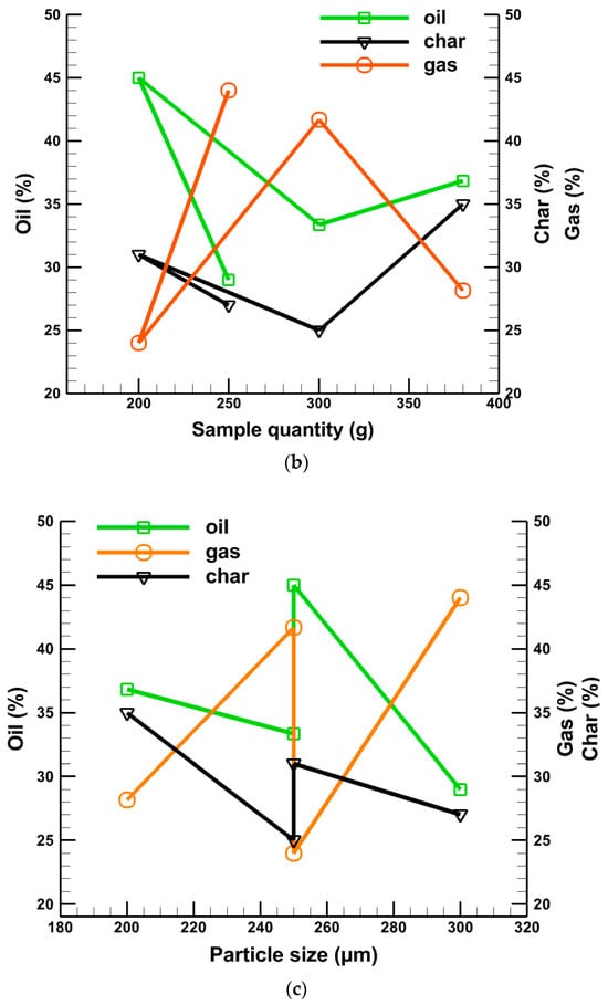 Effects of (a) temperature, (b) sample quantity, and (c) average particle size on produced liquid oil, char, and gas.