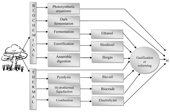 Routes by which hydrogen can be produced from biomass [39].