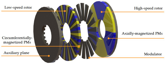 The proposed auxiliary flux-enhancing structural axial-type magnetic gear (AFS-AMG) contains four planes, and its structure is depicted in Figure 1.