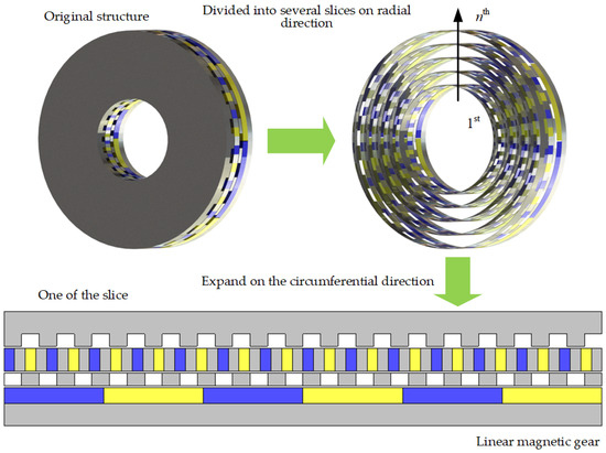 For AFS-AMG, its air-gap region has a thin disk shape, and its torque generation method is different from that of RMGs. Hence, to analyze its torque generation mechanism, the AFS-AMG is divided into several slices in the radial direction, and each slice is spread in the circumferential direction on a plane. Hence, the analysis of AFS-AMG can be simplified into analyzing a linear magnetic gear, as depicted in Figure 2.