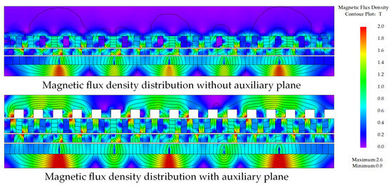 Figure 3 illustrates the magnetic flux density and flux-line distribution on a given slice of the AMG with and without the auxiliary plane simulated in finite element analysis (FEA) software JMAG 22.0. It can be observed that without the auxiliary plane, the magnetic flux path passes through the air region several times to form a closed loop. Since the permeability of air is much lower than that of iron, the magnetic reluctance of the whole loop is very large, leading to a small magnetic flux density in the air gap. However, when the auxiliary plane is added to the outside of the spoke-type PMs, the corresponding flux line changes to pass through a path with smaller reluctance. Hence, the magnetic flux density in the air gap increases, leading to a larger electromagnetic torque.