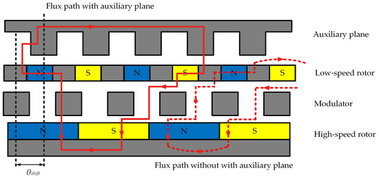 The flux-enhancing effect of the auxiliary plane can also be illustrated by the imaginary flux-line path, as shown in Figure 4. The auxiliary plane acts as a pivotal element in enhancing the magnetic flux within the system, thereby contributing to its overall efficiency and effectiveness. Additionally, the displacement angle between the auxiliary plane and modulator , as defined in Figure 4, should be equal to zero for maximum torque generation [29].
