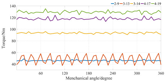 To make AMGs with different pole-pair combinations comparable to one another, the gear ratio range is settled at the first stage. Since the gear ratio G should not be an integer to avoid large torque ripple [32,33], its value is set within a range between four and five in this work. Additionally, since iron bars are required to be inserted between each circumferentially magnetized PM, should be too large to prevent manufacture difficulties. Hence, the possible pole-pair combinations for AFS-AMGs are listed in Table 2. Figure 5 depicts the electromagnetic torque waveforms on the low-speed rotor of the AFS-AMG with different pole-pair combinations with the same geometrical size. Since the volume of the whole AFS-AMG and PMs do not change with the pole-pair combination variation, it is enough to use as the judgment standard. It can be observed that the 4–19 pole-pair combination has the largest torque, and a relatively low torque ripple. Hence, the 4–19 pole-pair combination of AFS-AMGs is chosen for further geometrical parameter optimization.