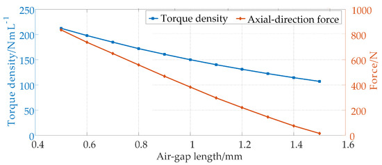 Variation in torque density per volume and axial-direction force on the modulator with respect to air-gap length in AFS-AMGs.