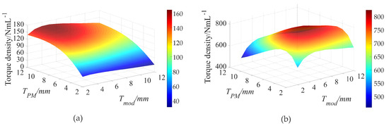 Variation in torque density with respect to the thickness of modulator teeth and PMs: (a) ; (b) .