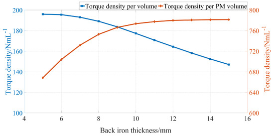 The thickness of the back iron of the high-speed rotor and auxiliary plane will influence the magnetic saturation, which further affect the electromagnetic torque. To simplify the optimization process, the thickness of the back iron of the high-speed rotor and auxiliary plane are set to be equal, which is represented by . Figure 8 depicts the variations in torque density per volume and torque density per PM volume with respect to . It can be observed that the variation trends in and are in conflict with each other. However, the increasing gradient of becomes smaller when the value of is above . Hence, in this paper, is set as .