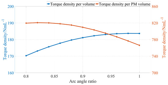 Figure 9 depicts the variations in torque density per volume and torque density per PM volume with respect to the arc angle ratio . It can be observed that the variation trends in and are in conflict with one another. The decreasing trend in becomes prominent when is above 0.9, while the increasing trend in becomes indistinctive when is above 0.9. Hence, is chosen as 0.9 in this paper.