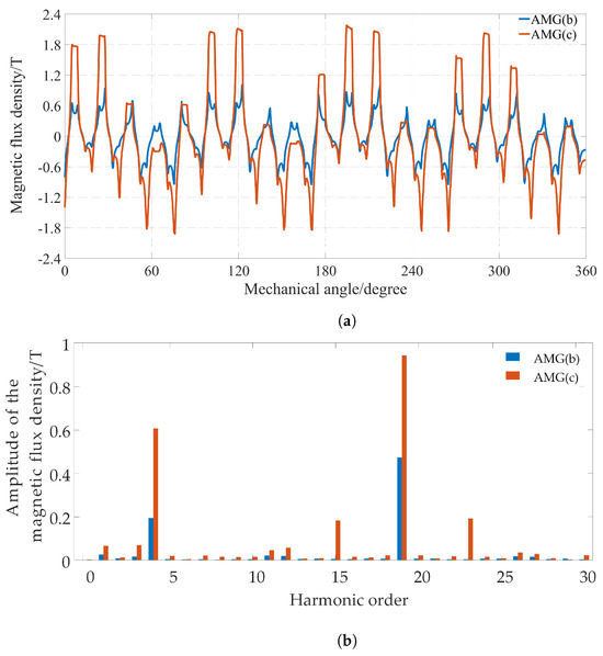 The axial-component magnetic flux density distributions in the air region between the auxiliary plane and the low-speed rotor and the corresponding fast Fourier transform (FFT) of AMG(b) and AMG(c) with radii of 60 mm are depicted in Figure 13. It can be observed that for AMG(c), namely, the AFS-AMG, the amplitudes of working harmonics, namely, the 4th and 19th harmonics, are much larger than those in AMG(b), leading to a torque increase.