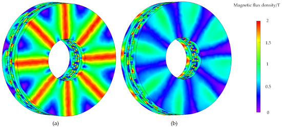 The magnetic field distribution of the proposed AMG viewed from the face with fewer PMs and the face with more PMs is shown in Figure 14. It can be observed that the back iron is more easily saturated on the side with fewer PMs, while the auxiliary plane has a lower magnetic field density.