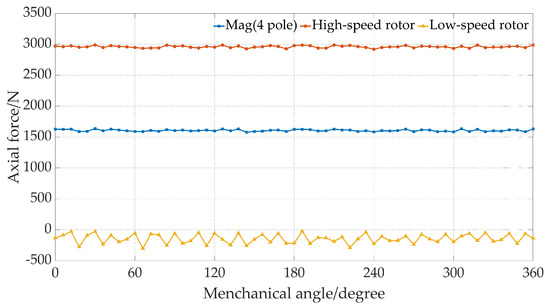 Figure 15 illustrates the axial forces exerted on all components of the AMG, encompassing both the low-speed rotor and the high-speed rotor. Notably, the axial force experienced by the low-speed rotor is relatively significant, reaching 2960 N. Consequently, the axial forces acting on the magnetic steel (N-pole) and the back iron are computed separately for a detailed analysis. Given that the north pole comprises four pieces of magnetic steel, the axial force exerted on each piece is approximately 400 N. This value falls within the tolerance limits of the manufacturing process, indicating its feasibility. In contrast, the average axial force on the high-speed rotor is quantified at around 123 N, a comparatively lower value. The low-speed rotor, due to its reduced speed, completes fewer revolutions per unit of time. Consequently, the frequency of relative motion between the rotor and the modulator is diminished. This infrequency in interaction leads to increased discontinuities in the forces acting on the rotor. Such discontinuities increase the variability in axial force experienced by the low-speed rotor. This is in contrast to the high-speed rotor, where the more frequent interactions due to higher rotational speeds result in a smoother and more continuous force profile, thereby reducing force fluctuations.